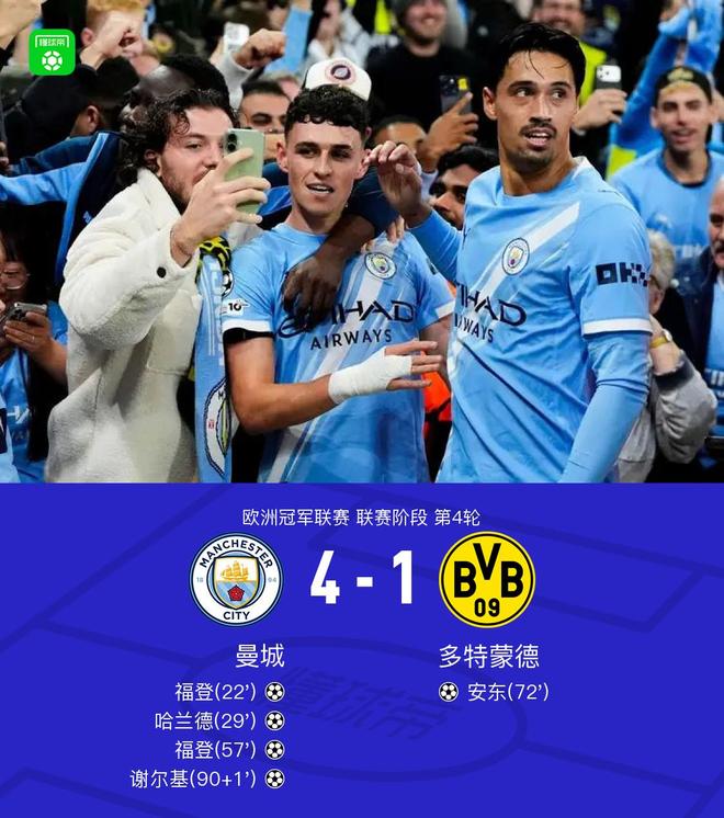 北京时间11月6日,欧冠联赛第四轮比赛开始。曼城对阵多特蒙德。上半场,福登远角破门,奥莱利射门被挡出,哈兰德凌空破门,阿德耶米低射被多纳鲁马扑出。下半场,福登射门梅开二度,安东推射破门,西尔基远射锁定胜局。全场比赛结束,曼城4-1战胜多特蒙德。关键时刻:第22分钟,福登禁区外射门,皮球飞入远角。曼城1-0领先多特蒙德。第29分钟,多克左侧传球。哈兰德禁区内射门得分。曼城2-0多特蒙德。第57分钟,福登禁区前射门。他远角梅开二度,帮助曼城3-0战胜多特蒙德。第72分钟,安东门前射门危险。多特蒙德1-3曼城。第90分钟西尔基进球这是一个远景。曼城4-1多特蒙德。两支球队的球员都参加了比赛。比赛进行到第9分钟,福登禁区外远射,但被门将挡出。第14分钟,萨比尼奥右路突破,被斯文森放倒。第16分钟,福登主罚任意球射入远角,但科贝尔将球没收。第22分钟,福登禁区外射门击中远角。曼城1-0领先多特蒙德。第27分钟,哈兰德传球,奥莱利破门。第29分钟,多克左路传中,哈兰德禁区内射门。曼城进球了。曼城2-0多特蒙德。第32分钟的动作太多了。吉拉西用鞋底打败了多克。第39分钟,阿德耶米右路插上,补射破门。多纳鲁马扑出了球。第45分钟,科贝尔禁区外射门将球破坏。曼彻斯特第47分钟,曼城反击,萨比尼奥右路突破,一脚低射攻门。科贝尔扑出了球。第55分钟,进攻区域配合得很好。哈兰德左脚低射被科贝尔没收。第57分钟,福登禁区远角头球破门。第二次是曼城3-0多特蒙德。第62分钟,他们错失良机。萨比尼奥没有防守,一脚高射。第65分钟,吉拉什右侧小角度抽射打偏。多纳鲁马扑出了球。第67分钟,阿德耶米突入禁区。一记低射击中球门,球擦过门柱。第69分钟,哈兰德与埃姆雷·詹发生激烈肢体冲突,也导致两人发生口角。第72分钟,安东赫门前射门推射。多特蒙德 1-3 曼城 阵容技术统计